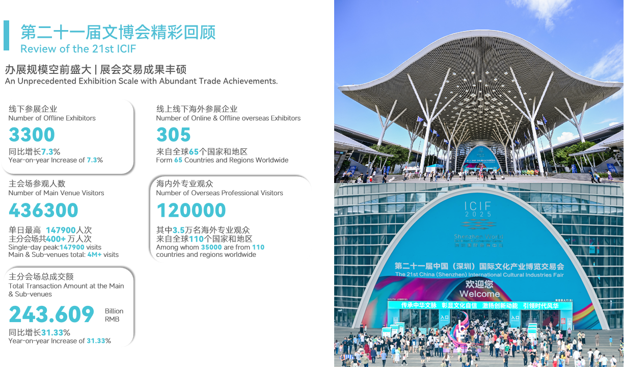 由中共中央宣传部、中华人民共和国文化和旅游部、国家广播电视总局共同主办,深圳市人民政府承办的文博会,历经二十余载发展,已成为中国规模最大、影响力最广的文化产业盛会。