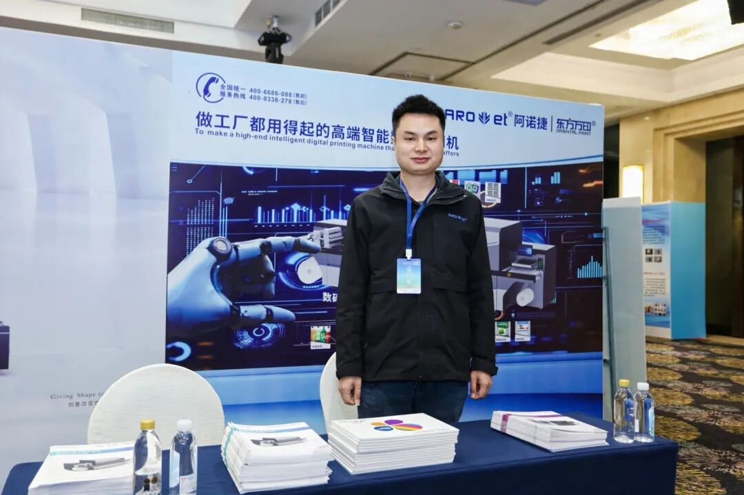 广东阿诺捷喷墨科技有限公司标签事业部总经理肖伟胜先生围绕《数字印刷+AI+防伪溯源为标签企业赋能》展开分享,他从产品定位与服务实力、什么是“高端智能”、为什么用的起、AI应用+防伪溯源四个维度做了详细介绍,“AI赋能,数字创未来”,阿诺捷不止于印刷,印刷+喷码一体,更有整体化的解决方案,致力于造所有印厂都用的高端数码印刷机。