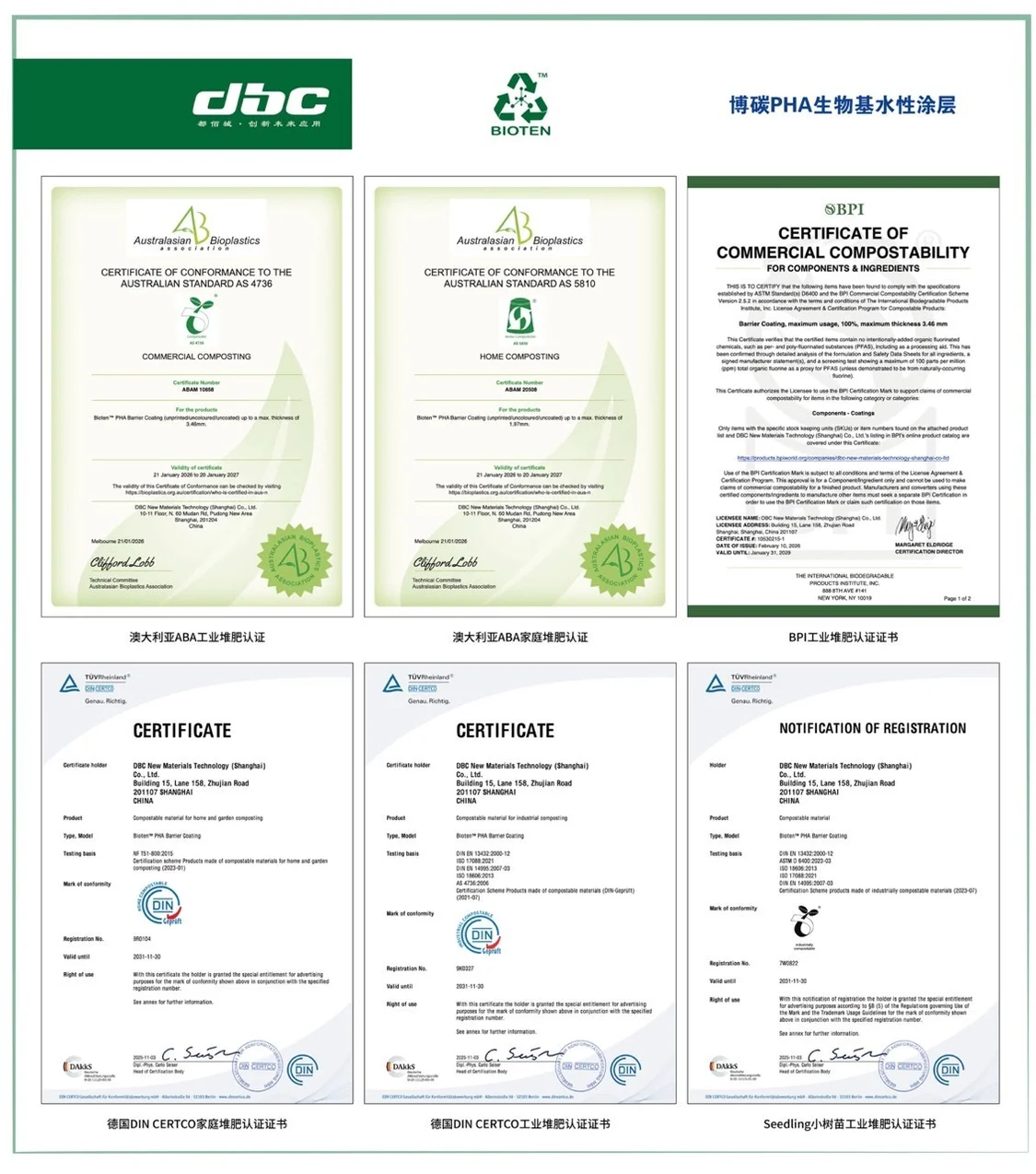 近日,中国创新型科技企业都佰城(DBC)正式宣布:旗下核心创新成果——Bioten™(博碳)PHA生物基水性阻隔涂层,顺利通过各项严苛审核,成功斩获 BPI(北美)、DIN CERTCO(欧洲)、ABA(澳新)国际三大权威堆肥认证,并取得涵盖植物生态毒性测试的 Seedling Logo(欧洲“小树苗”)标识。