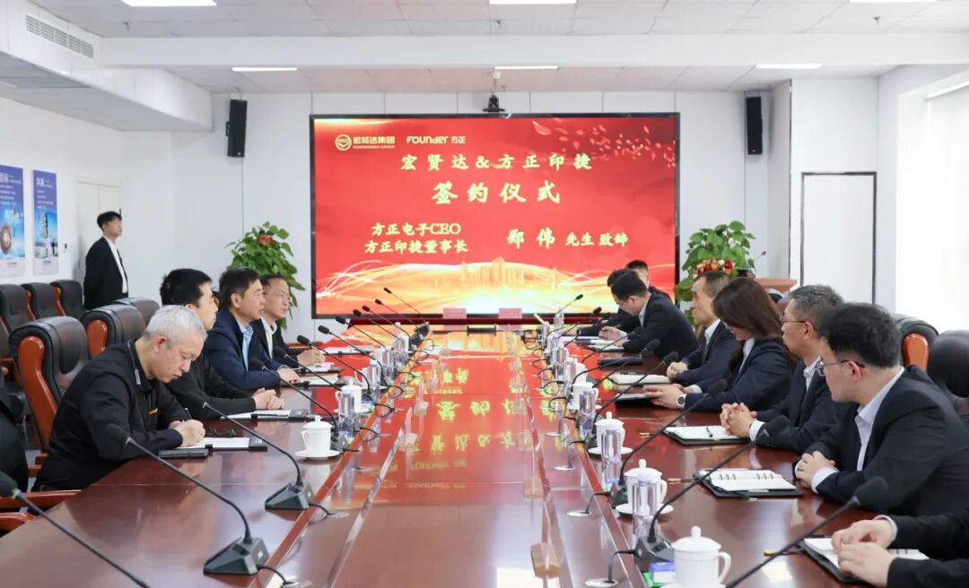 方正电子CEO、方正印捷董事长郑伟,宏贤达集团董事长、总裁张俊贤及双方代表出席仪式。