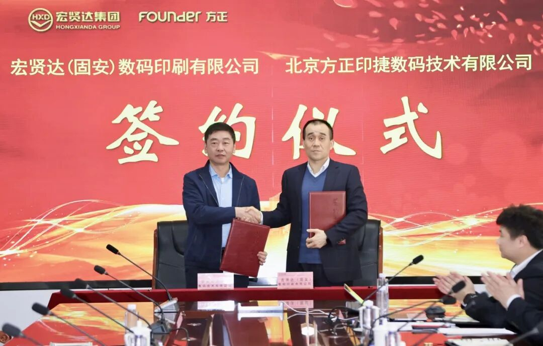 4月10日,方正印捷与北京宏贤达物流集团有限公司旗下宏贤达(固安)数码印刷有限公司在河北固安举办印刷设备采购签约仪式。双方正式签署协议,宏贤达集团引进2台方正桀鹰P8800HD高清黑白喷墨轮转印刷机,共同推动图书按需印刷(POD)与出版供应链深度协同发展。