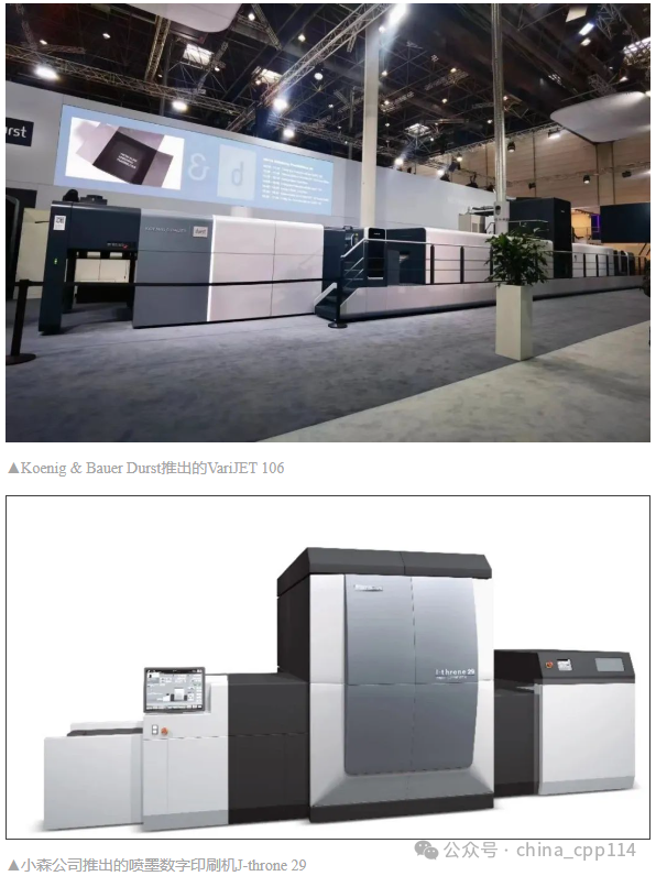 作为一项传统印刷技术,我们看到,胶印在设备设计上更加追求效率的极致提升,借助自动化和智能化装置以及数字化软件,缩短换单时间,提升设备综合效率,同时胶印设备厂商也在持续创新,延长自己的产品线。海德堡和佳能合作,推出了基于B3幅面的Jetfire 50和基于B2幅面的新型Jetfire 75单张纸喷墨解决方案;科尼希鲍尔首次公开展示的由合资企业Koenig & Bauer Durst推出的VariJET 106印刷机,其生产的印刷样品展示了其应用的广泛性,诸如药品、保健品和化妆品以及食品和饮料包装等;小森公司单面印刷速度为每小时6,000张,可以提供全球顶级ROI(投资回报率)的B2幅面单张纸UV喷墨数字印刷机J-throne 29,在drupa 2024展会上实现全球首秀,数字印刷设备性能愈发成熟。