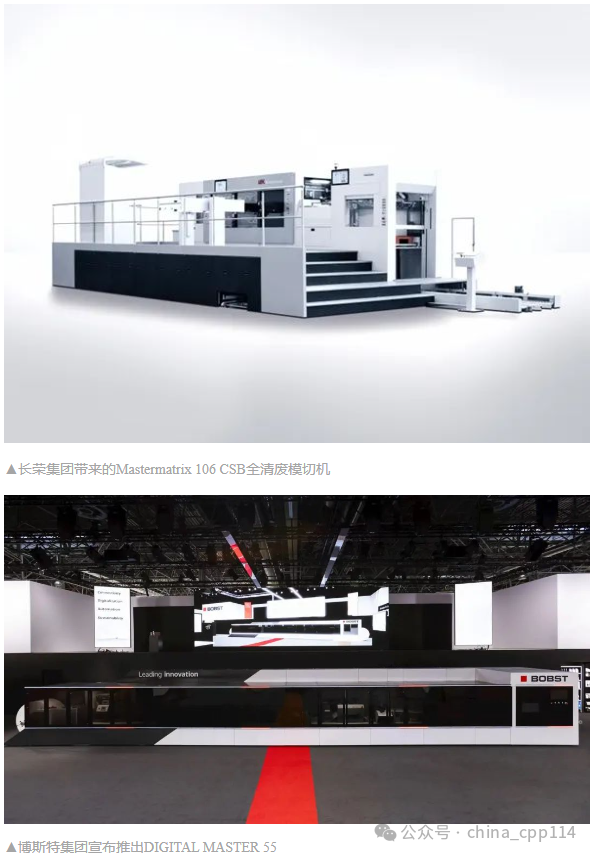 本届德鲁巴展会,长荣集团再次与海德堡联袂登场,展示从印前到印后全流程解决方案,展示的设备有Mastermatrix106 CSB全清废模切机、Duopresspower106 FCSB双机组全清废模切烫金机、Diana eye55等;精密达携带Digtal Robot数码机器人胶订线的最新升级版和Superbinder-8000e全自动胶订联动线参展;东莞浩信CP在展会现场搭了建一个小型印后数字智能工厂;炜冈展出ZJR-350G机组式柔性版印刷机和组合式高速全轮转套筒胶印机;劲豹机械携丝网印刷设备全系列产品阵营精彩亮相;至一科技展出设备为书口美学印刷机;圣德科技现场展示圣德精彩M440C彩色高速喷墨印刷机和圣德精驰HD12000单张纸高速喷码机;科雷重点展示全龙域双鼓高速CTP TP-DD870、雷霸TP-72128Hn CTP、雷霸UVP-46128G+ CTP等自动高端印前制版创新解决方案,还展示超大幅面高端柔印数码制版解决方案—HDI-2000H+高清数码柔版成像机以及EZC智能数字放墨系统;万德数科展示了最新的包装行业数字喷墨技术—基准物理精度1200npi的多款高精彩色数字印刷机;润天智携J-350GT高清数码标签印刷机和Phenix440C高速喷墨书刊印刷机亮相,现场演绎喷墨印刷智造的新业态、新方向;汉弘集团旗下汉华工业全球首发全新高精Single Pass瓦楞纸板数字喷墨印刷机——Glory160X HD,旗下弘博智能发布最新一代的书刊&标签数字喷墨全面解决方案;正润机械展出RB6040A全自动纸盒成型机,一次性完成有效代替人工生产;浙江豪盛隆重推出新一代极速EXC1500卓越版双螺旋卷筒纸分切机,在切长400~700mm区间之内,创造性地增加了30%~74%的生产速度;浩达智能展示的ZFM-700K系列全自动快速封面机采用运动控制器系统,最高速度达到35个/分钟;凌云光展出了LabelHERO-F离线质量检测系统、PacKHERO-F离线质量检测系统、CartonHERO胶印在线质量检测系统等创新展品;潍坊东航展出F1系列、F2系列、F3系列柔印机;大恒图像展出明星产品高速小张检品机,最高检测速度可达13万张/小时;晟图机械带来了高速侧翼皮壳一体机ST040H 和ST1050丝印冷烫镭射多功能生产线;航天华阳携带全新一代高端机型Cinova-S参展,采用全自动印刷气动锥顶结构,其机械设计速度达到600米/分钟;国望机械带来数字快速转换T106BF全清废自动模切机和D150智能双螺旋分切机;BindEx英厚机械展示全新数码胶装系列产品——ECOBINDER(百德)智能胶装机、GALAXY(银河)MAX 智能胶装机、EXPLORE(探索)智能胶装机,以及JAZZ100e三面刀、EMPIRE(帝王)35e全智能纸袋机和量子120护封腰带机;陕西北人带来全新升级的至睿4.0塑料软包装凹版印刷机……