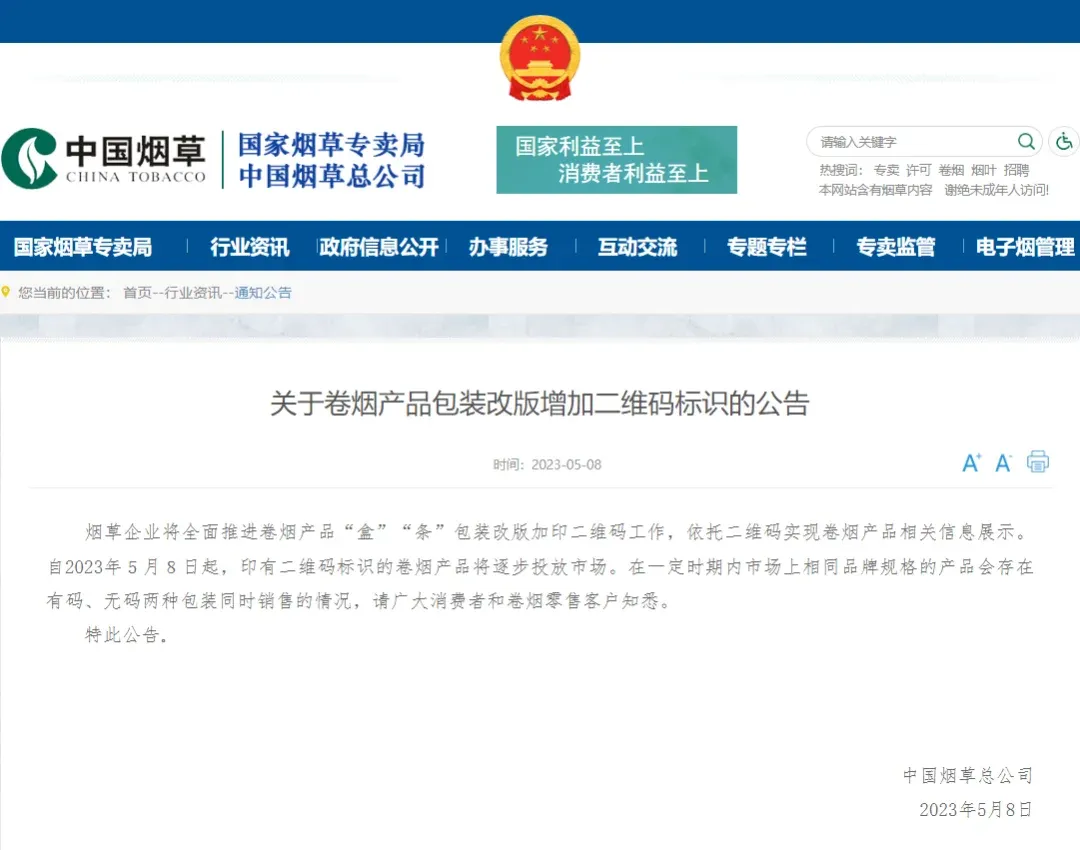 众所周知,卷烟造假现象由来已久。为了保障消费者和烟草企业的利益,部分烟草公司已开始着手建立烟草溯源系统,以此遏制卷烟造假势头。国家烟草专卖局发布“关于卷烟产品包装改版增加二维码标识的公告”,其中提到,烟草企业将全面推进卷烟产品“盒”“条”包装改版加印二维码工作,依托二维码实现卷烟产品相关信息展示,自2023年5月8日起,印有二维码标识的卷烟产品将逐步投放市场。