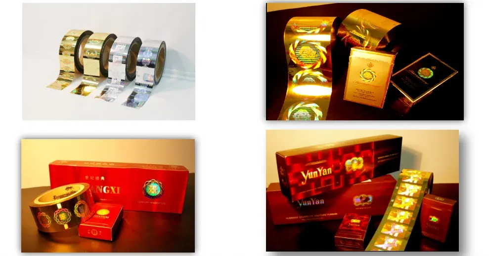 全息防伪烫印膜分为定位烫印膜、随机烫印膜 、洗铝烫印膜 、刮刮烫印膜等,全息防伪效果可涵盖立体技术、浮雕技术、猫眼透镜技术、点光源加密技术、微缩文字技术、多通道技术、光学变色技术等。主要应用于烟包、酒包、化妆品、药品、食品包装等领域,适应白卡纸、油墨、塑料、金属、玻璃等制品的烫印。