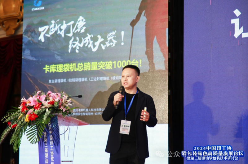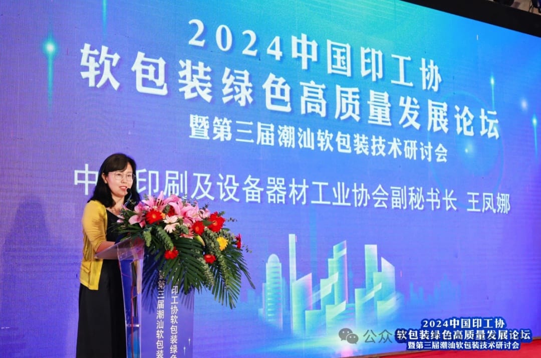 中国印刷及设备器材工业协会副秘书长王凤娜亦发表致辞。王凤娜表示:“潮州一直被称之为美食之都,本次活动得到了行业各个单位的大力支持,旨在探讨行业高质量发展之路,不仅承载着期待与使命,更有融合共生的责任。面对全球产业链深度调整,以及环保法规愈加严格、消费者需求多元化等挑战,高质量发展是企业的必然选择也是行业的必然趋势。2024年是新中国成立的75周年,是实现“十四五”规划目标任务的关键一年,也是软包装行业迈向高质量发展的新节点,希望大家能借助这一高端对话平台,实现产业链协同发展,把握新机会,共绘新蓝图。最后,预祝大会圆满成功。”