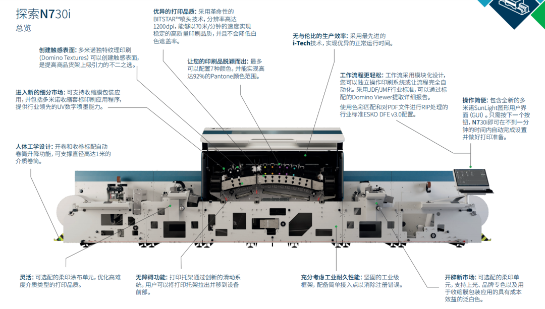 从上面这张图片我们看到N730i的所有技术亮点。包括颠覆性的BITSTAR喷头技术、i-Tech技术、分辨率高达1200dpi、70米/分钟的印刷速度,最多可以配置7种颜色,并能实现高达92%的Pantone颜色范围。还可选配涂布柔印单元,并且支持上光、品牌专色以及用于收缩膜包装应用的具有成本效益的泛白色,优势显而易见。