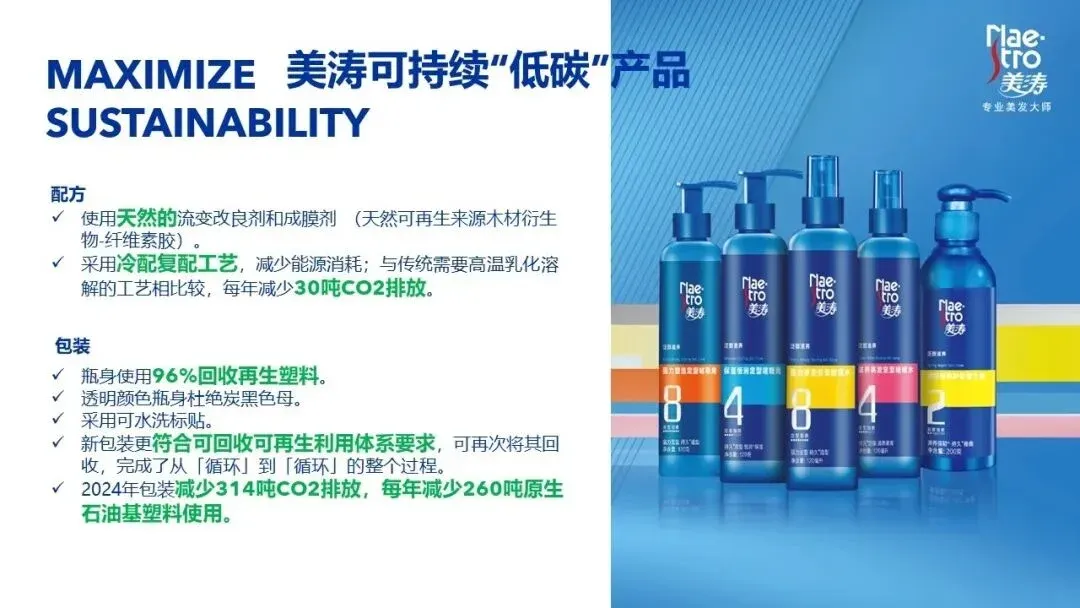 2024年美涛啫喱水,啫喱膏和弹力素全线新产品包装升级,瓶身使用96%回收再生塑料,每年减少260吨原生石油基塑料使用,2024年包装减少314吨CO₂排放。透明颜色瓶身杜绝炭黑色母; 采用可水洗标贴,新包装更符合可回收可再生利用体系要求,可再次将其回收,完成了从「循环」到「循环」的整个过程。