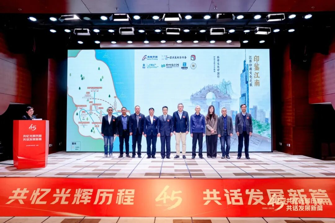 大会最后举行“科学文化中国行-印刷之旅”启动仪式。项目由中国科协组织开展,中国印协联合江苏省科协、江苏省印协共同打造,串联7家代表性单位,融合智能工厂、古籍工坊等多元场景,完整呈现非遗传承与技术创新的发展脉络。中国印刷技术协会常务副理事长陈迎新、中国科协科技导报社副社长史永超、江苏省科协调研宣传部部长张红兵、江苏省印协副会长马绪全共同上台启动项目,标志着这条特色行业文旅线路正式开启。