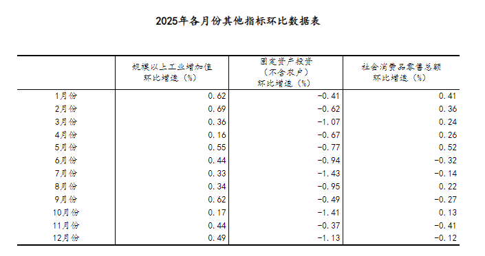 (2)根据季节调整模型自动修正结果,对近一年来各期国内生产总值、规模以上工业增加值、固定资产投资(不含农户)、社会消费品零售总额环比增速进行修订。修订结果及2025年四季度GDP环比数据、2025年12月份其他指标环比数据如下: