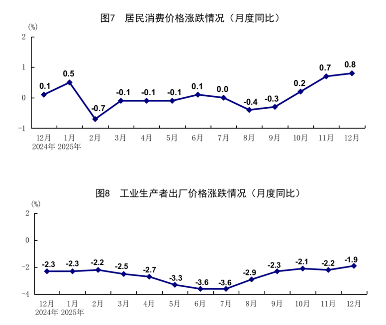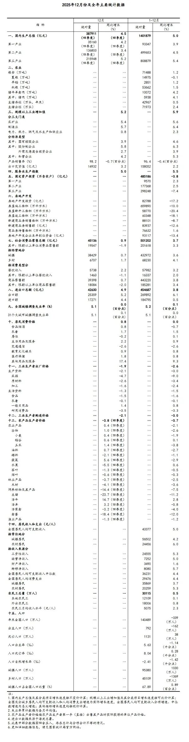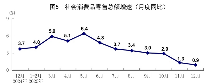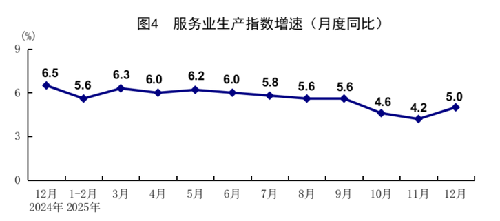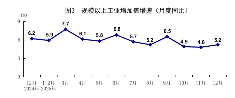 工业增加值:2025年全年,规模以上工业增加值同比增长5.9%,12月,同比实际增长5.2%。