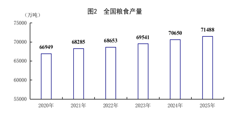 全年全国粮食总产量71488万吨,比上年增加838万吨,增长1.2%。其中,夏粮产量14975万吨,下降0.1%;早稻产量2851万吨,增长1.2%;秋粮产量53662万吨,增长1.5%。分品种看,小麦产量14007万吨,基本持平;玉米产量30124万吨,增长2.1%;稻谷产量20904万吨,增长0.7%;大豆产量2091万吨,增长1.3%。全年猪牛羊禽肉产量10072万吨,比上年增长4.2%,首次超过1亿吨。其中,猪肉产量5938万吨,增长4.1%;牛肉产量801万吨,增长2.8%;羊肉产量496万吨,下降4.2%;禽肉产量2837万吨,增长6.7%。牛奶产量4091万吨,增长0.3%;禽蛋产量3498万吨,下降2.5%。全年生猪出栏71973万头,增长2.4%;年末生猪存栏42967万头,增长0.5%。