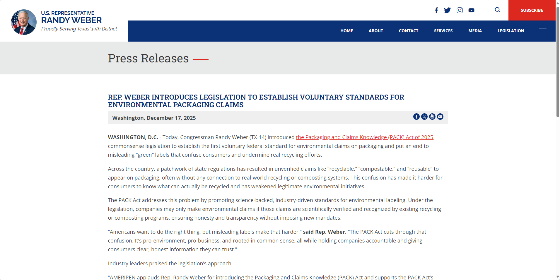 《包装与循环经济法案》0000000000000000000000000000000000(PACK ACT)于2025年12月17日由美国众议员兰迪·韦伯提出,在行业内引发了剧烈震荡。该法案的核心目的在于统一全美范围内关于“可回收包装”声明的监管规定,终结长期以来困扰消费者的标签乱象。