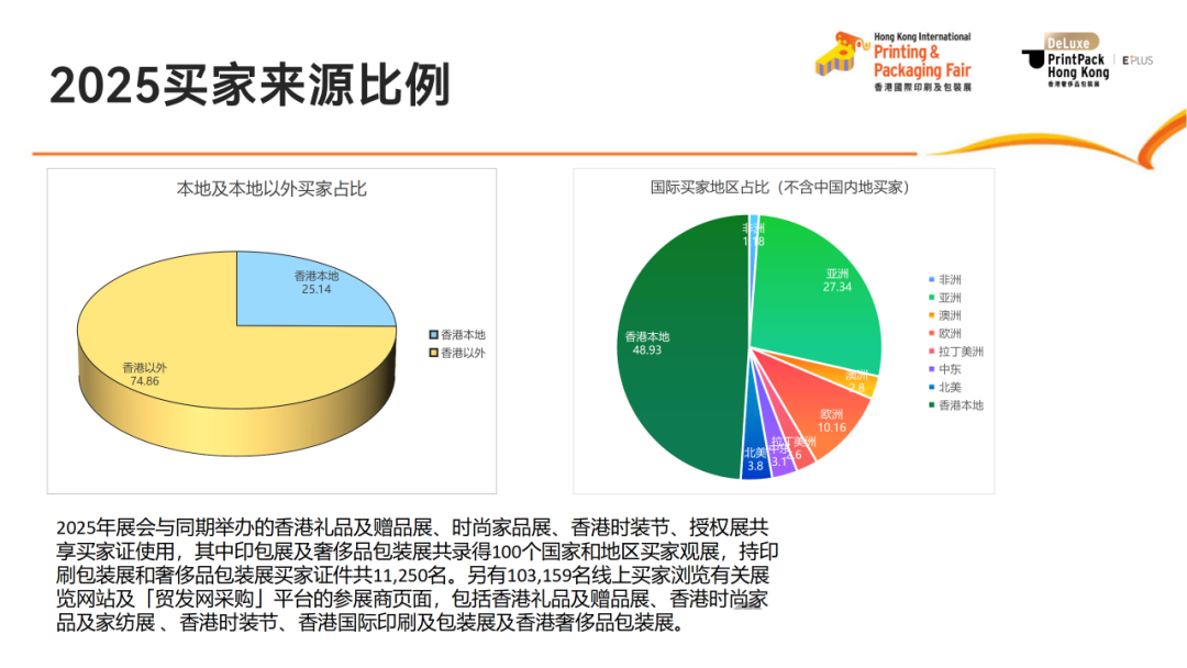作为国际展览联盟(UFI)认证的专业品牌展会,香港印包展的规模与影响力持续升级。2025年展会共吸引来自6个国家和地区的494家参展商,覆盖印刷服务、包装方案、电商包装、食品包装、耗材及设备等全产业链环节;买家覆盖全球100余个国家和地区,线上线下联动进一步拓展了商贸半径。参展商满意度较2024年全面提升,在展位布局、买家精准度、商贸对接效率等关键指标上均实现同比增长。