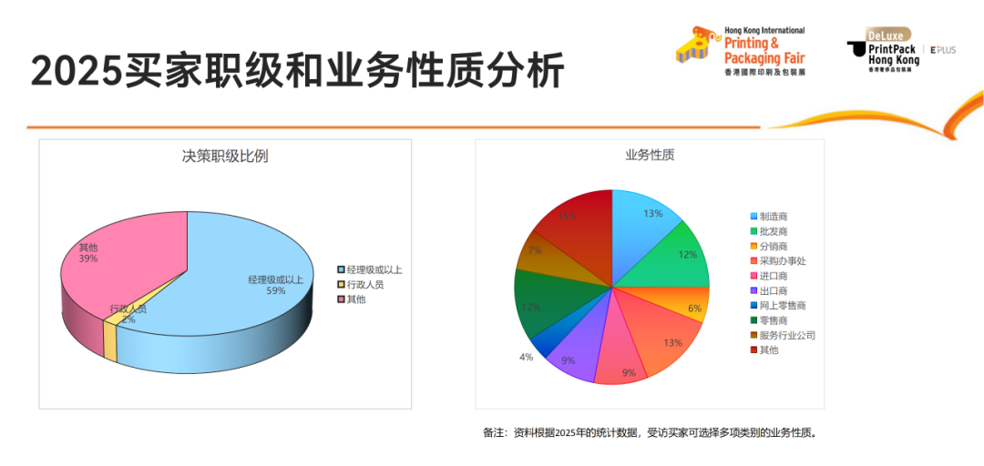 这一动向背后,折射出香港印包展在行业中的独特定位:它并非传统意义上的设备与耗材交易平台,而是一个印刷包装服务供应商与终端用户直接对接的商贸枢纽。在多数印刷包装类展会中,参展商以设备制造商、耗材供应商为主,台下买家多为印刷厂、包装厂;而香港印包展的参展主体是印刷服务商、包装解决方案提供商、创新材料企业,到场采购的则是来自全球制造业、消费品、日化、食品、酒类、医药等行业的终端用户。这一结构差异,决定了参展企业在这里触达的是“真正的买家”——那些直接为产品采购印刷包装服务的企业决策者。