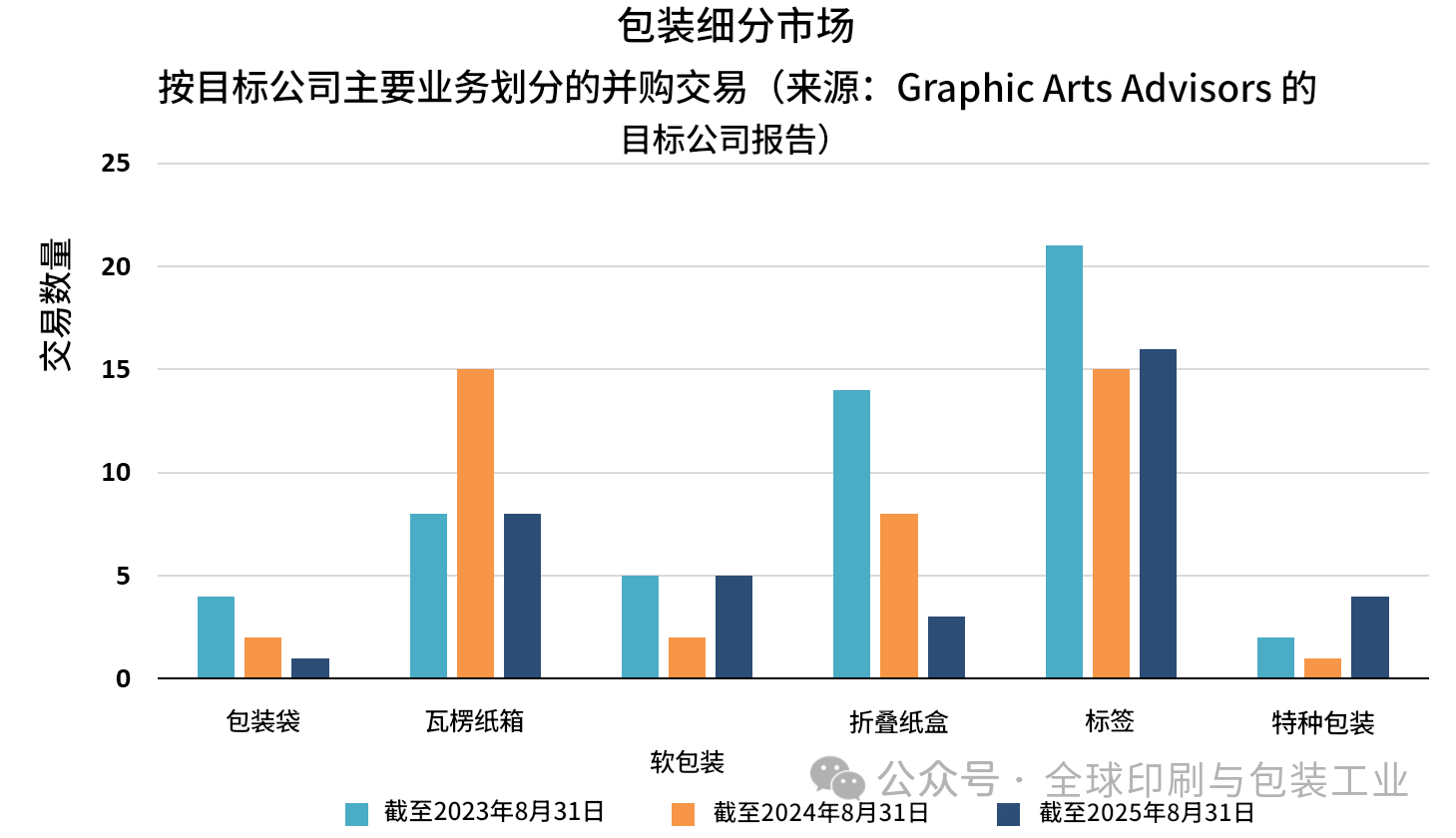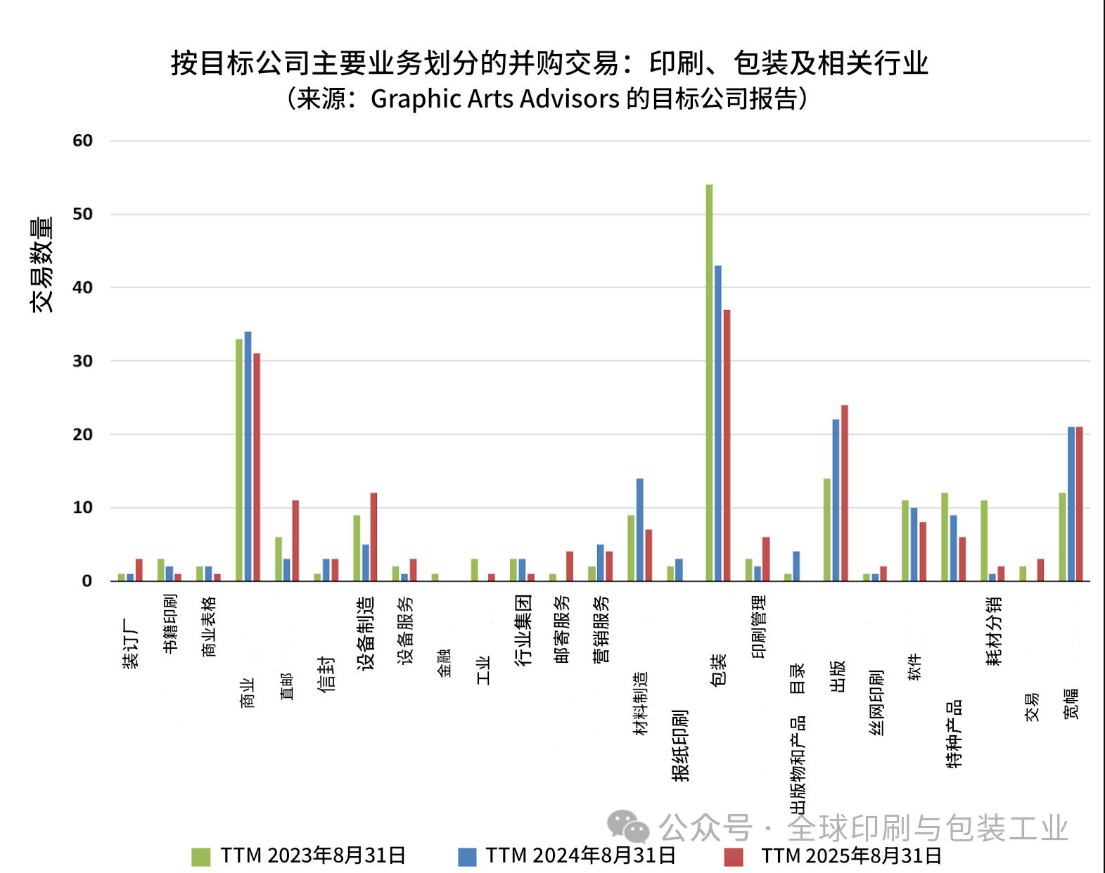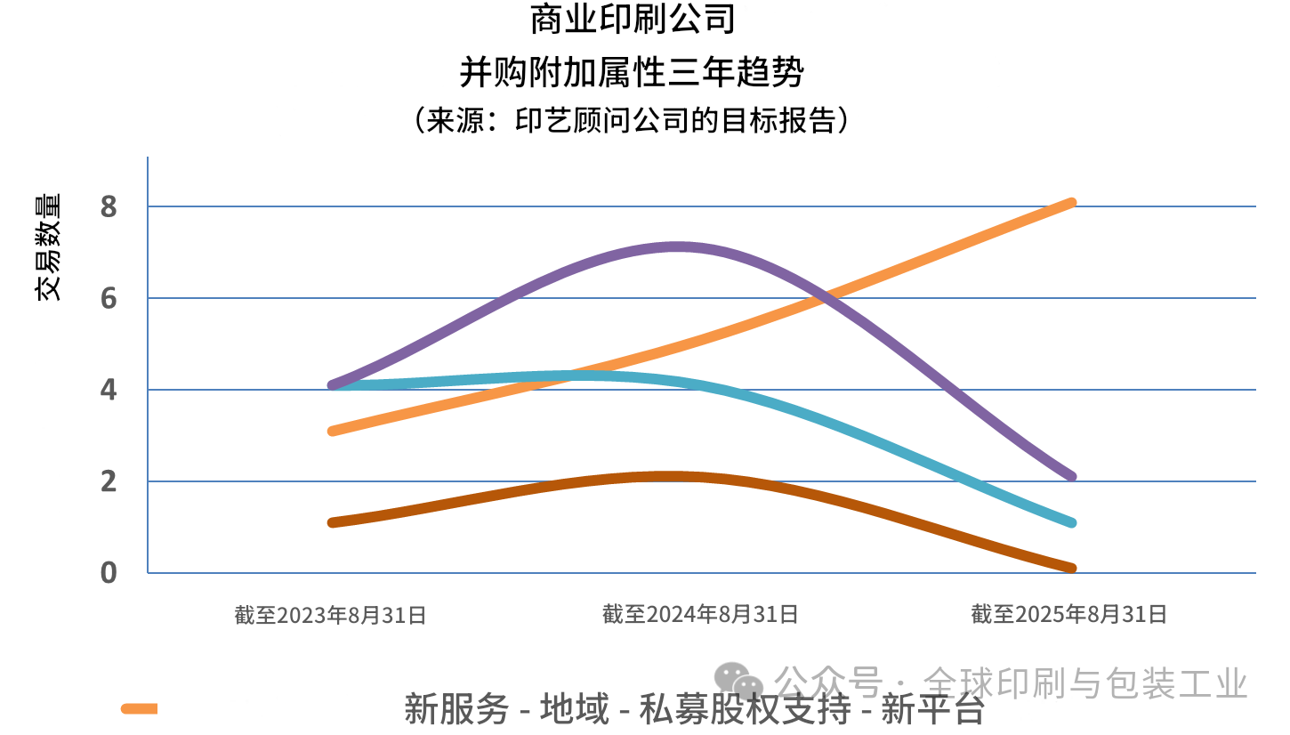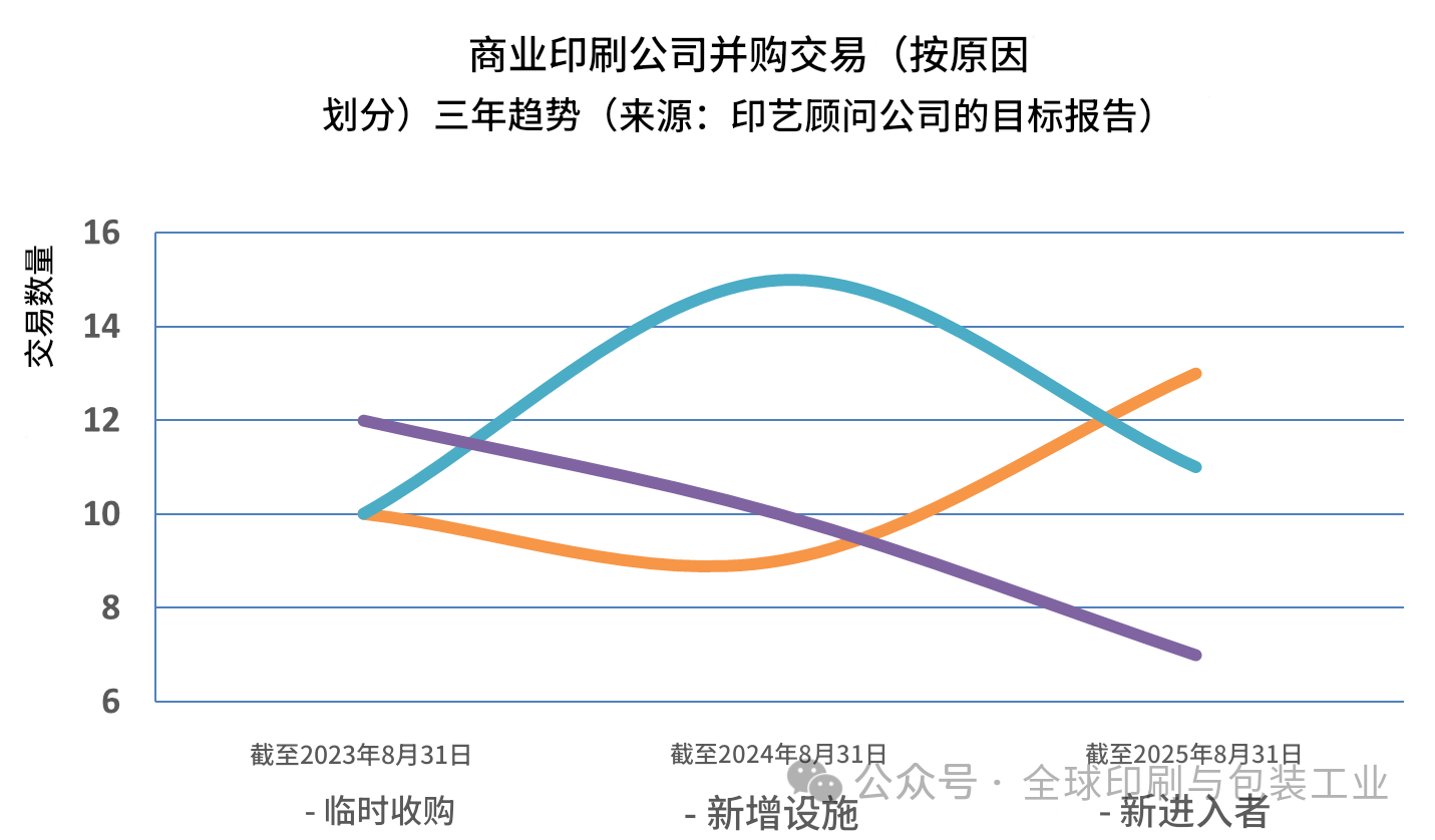 十四年来,GAA(印艺顾问公司)持续记录与评论以包装印刷行业为中心的多条业务线的并购活动,重点覆盖商业印刷、包装(标签、折叠纸盒、软包装)、大幅面印刷市场等。在每年8月,都会回看过去12个月的交易特征,以判断行业的未来走向:哪些细分的并购增多或减少?买方完成收购的主导逻辑如何变化?是扩张网络还是并入整合?对未来各细分的潜在交易活动有何启示?