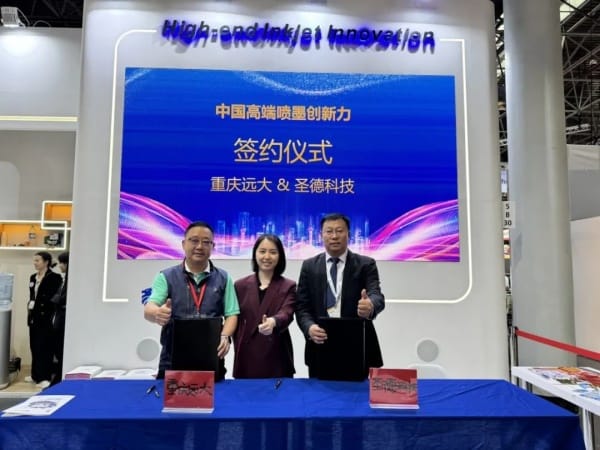 本次展会是圣德科技国际首秀,收获满满:成功与CGS ORIS、深圳盛事科技有限公司签约,开启战略合作,从而更好地为客户提供颜色更加准确和稳定的喷墨印刷质量;迎来国际展会上的首签,重庆市远大印务有限公司(以下简称“重庆远大")在drupa2024现场签购2台喷墨印刷设备。重庆远大和圣德科技的合作长达20多年,是圣德科技发展历程中的坚定支持者和见证者,此次签约代表双方合作进一步加深。