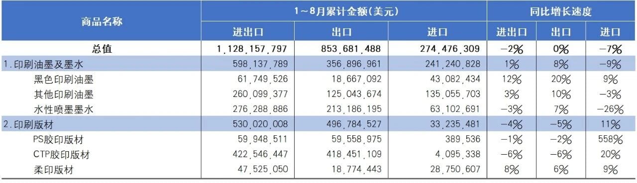 2025年1~8月国内三大类印刷相关商品进出口总体运行概况如下: