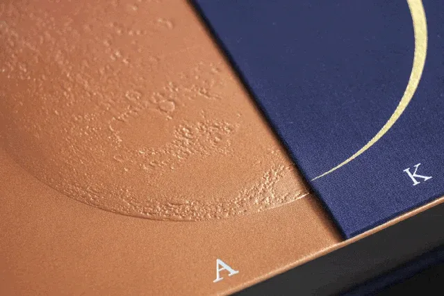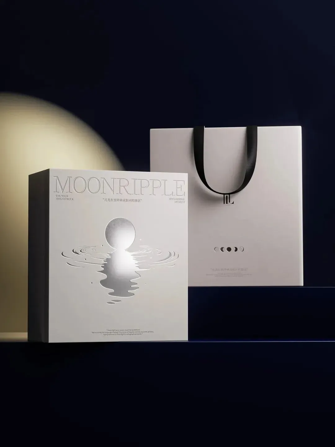 《月光奏鸣曲 》主题礼盒,设计师以独特的创意与精湛的包装工艺,打造出兼具美感与实用性的作品。 从包装设计来看,银灰色礼盒奠定了高端、典雅的基调,暗合月光清冷而神秘的气质。 上盖凹印烫银的月亮与涟漪图案,具象化了“月点银河”的 意境,烫银工艺让图案在光线下熠熠生辉,如同月光洒在银河上泛起的粼粼波光,极具视觉冲击力。