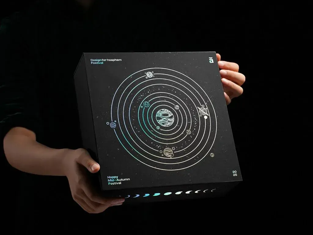 “宇宙精华”月饼盒采用全息箔纸印制行星和轨道,在黑色背景下犹如繁星点点的夜空,赋予产品科幻美学魅力。