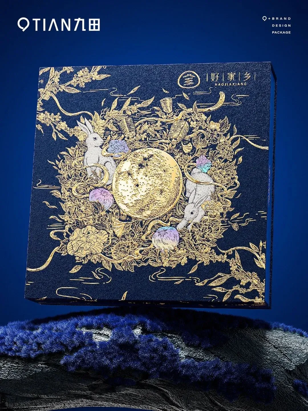这款中式韵味拉满的好家乡中秋礼盒。整体以靛蓝为主色调,搭配烫金作画--双兔跃月,缠枝生花,将千年中秋凝于方寸之间。盒面上的浮雕工艺突出皎洁月色,让礼盒成为月光下的家书,每一道金线都是未说尽的团圆。