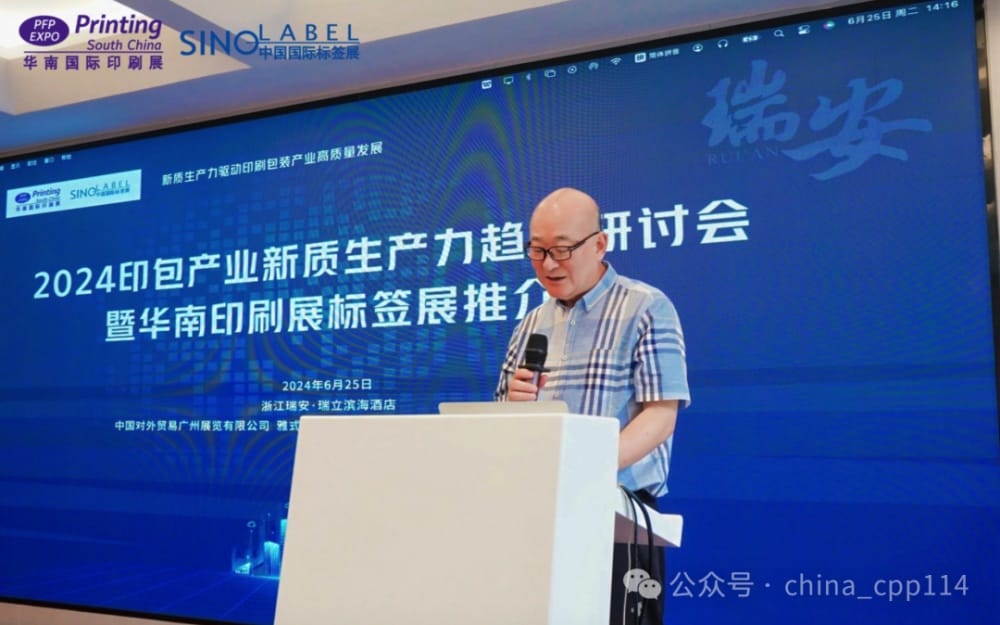 2024年6月25日,由中国对外贸易广州展览有限公司、雅式展览服务(深圳)有限公司、上海印搜文化传媒股份有限公司联合主办的“2024印包产业新质生产力趋势研讨会暨华南印刷展标签展推介会”,在温州瑞安瑞立滨海酒店顺利召开。来自江浙沪地区近50位嘉宾参会。