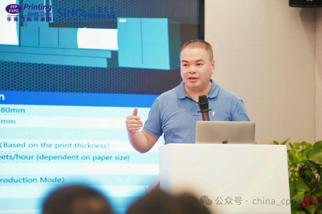 浙江炜冈科技股份有限公司销售经理朱清先生发表精彩演讲,他演讲的主题是——《工业5.0时代,智能制造如何赋能行业发展》。据了解,炜冈科技刚刚从德鲁巴印刷展归来,其数码印刷机全系列亮相德鲁巴,现场人气爆满。