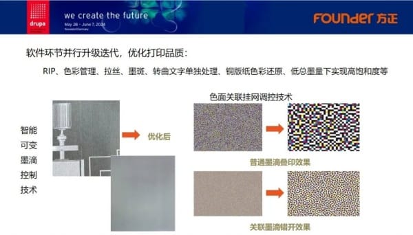 在喷墨控制方面,针对智能可变墨滴控制技术、色面关联挂网调控技术持续进行优化,实现了更加规整的墨滴形状、更精确的落点控制、更好的色密度。最终体现的可见成果为,光铜堆墨造成的墨斑大幅减轻、拉丝问题大幅缓解,打印品质全面提升。