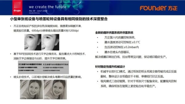 一直以来,方正电子倾注了大量资源在喷墨技术的研发上。在从600dpi标清喷墨向1200dpi高清喷墨演进的过程中,方正电子集中技术资源和力量,与外部专家合作,协力突破文字边缘、网点、机械传动等方面的技术瓶颈。目前,高清彩色喷墨印刷的打印质量,已经可以完全媲美传统胶印的精品印刷。其关键技术优势主要体现在机械平台、专用墨水、挂网算法、色彩管理等方面的精进升级。