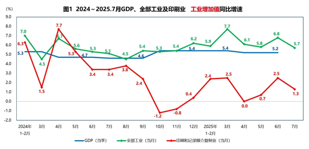 选用工业增加值指标,是用来做对比分析的,帮助我们了解全国经济走势、工业经济情况以及我们印刷业的情况(见图1)。全国经济走势,请看蓝线。GDP增速今年一季度为5.4%,二季度为5.2%,上半年的累计增速为5.3%。这个5.3%的增速,相比去年同期和去年全年都提升0.3个百分点,从数据看经济运行是平稳的,全年实现年初制定的5%目标问题不大。工业经济走势,请看绿线。工业增加值的月度增速,今年以来呈现波动态势,但各月都在5%以上,还不算低。我们印刷业的走势,请看红线。在41个大类行业中,印刷业增速的波动幅度是比较大的,而且比全部工业的平均水平低很多,徘徊于微增长区间。