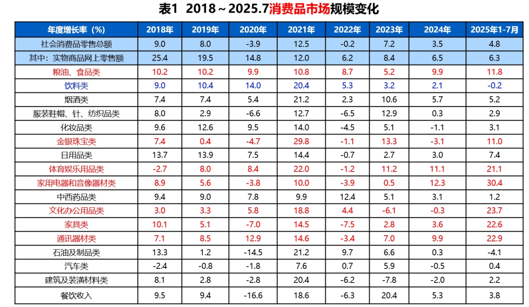 最后,请大家看一下消费市场的数据。研究这组数据,因为这里很多是印刷企业的客户行业,大家也可以从这组数据中感知经济的脉动。从总量上看,截至7月,全社会消费品零售总额的增速为4.8%,去年全年是3.5%,如此看来,消费数据是有所回升的(见表1)。回升集中在哪些品类?大家请看红色行,这些品类都实现了两位数的增长。具体来说,基于消费品以旧换新政策的支持,“家用电器和音像器材类”增速超过30%,“文化办公用品类”“家具类”“通讯器材类”的增速也均超过了20%。而升级类消费,像“体育娱乐用品类”“金银珠宝类”增长也比较快。相比之下,“烟酒类”增速为5.2%,“化妆品类”增速为3.1%,“中西药品类”增速为1.2%,而“饮料类”增速为-0.2%,我们的很多包装印刷企业正是这些品类的服务商。