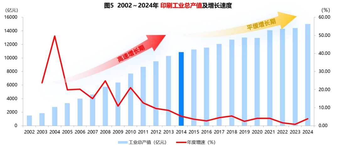 我们再来看下本世纪以来全行业产值规模的发展轨迹,2002-2024年的情况(见图5)。2002年,印刷产业的总盘子是1500亿元,到2024年已经有1.5万亿元,20余年间整整增长了10倍。其实在上世纪最后10年,到本世纪初的10年,印刷业一直处于“高速增长期”,每年增速基本都是两位数增长。但自拐点2014年以后,增速基本没超过5%,我们印刷业已经历了10年的“平缓增长期”。