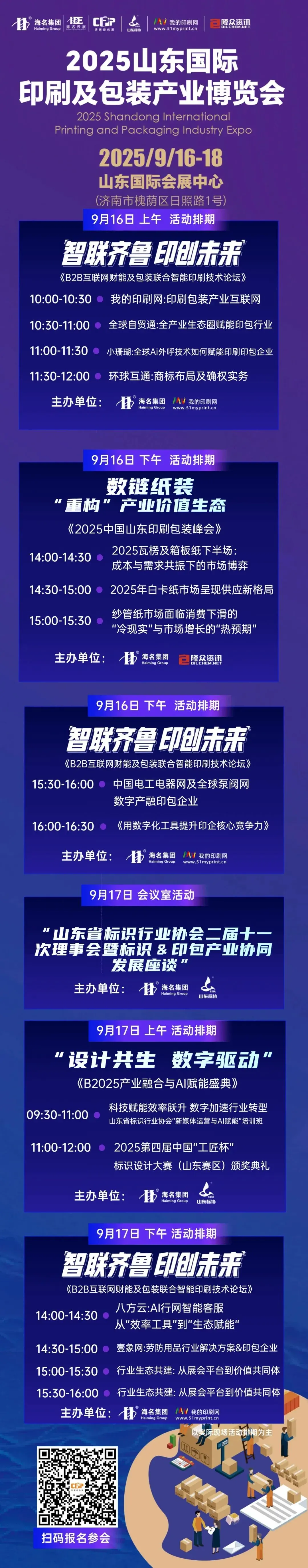 2025海名山东(济南)国际印刷及包装产业博览会将于2025年9月16日-18日在山东国际会展中心(济南槐荫区)举办!本届展会由海名集团主办,青岛海名国际会展有限公司承办,由中山市印刷包装行业协会、甘肃省包装技术协会、天津市包装技术协会、山东省标识行业协会、青岛市包装联合会、威海市包装印刷工业协会、烟台市印刷包装协会、烟台市包装行业协会、潍坊市印刷协会、玉田县印刷包装机械协会、东光县纸箱包装机械制造联合会、商河县印刷包装行业商会等众多行业协会大力支持协同组织。