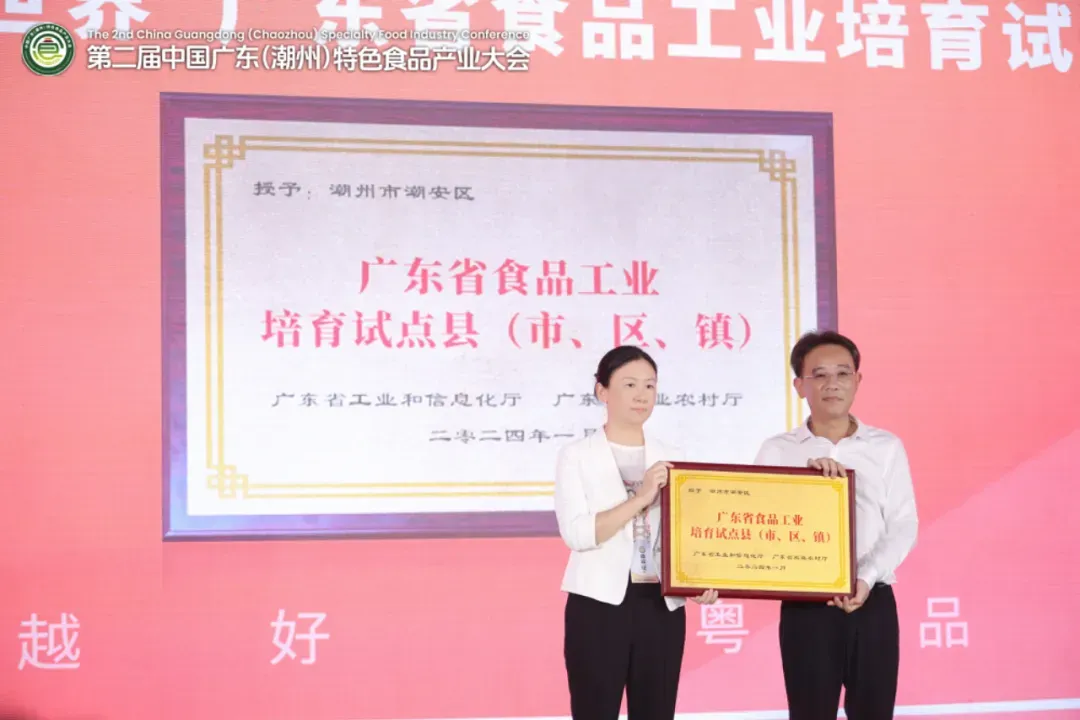 作为中国传统食品产业创新升级的示范区,潮州市以及潮安区特色食品产业也是广东省“粤食越好 粤品世界”培优扶强的重点食品产业集群之一。在第二届“潮食会”开幕大会现场,广东省工业和信息化厅为潮州市潮安区颁发“广东省食品工业培育试点县(市、区、镇)”牌匾,助力潮安区特色食品产业发展再提速。